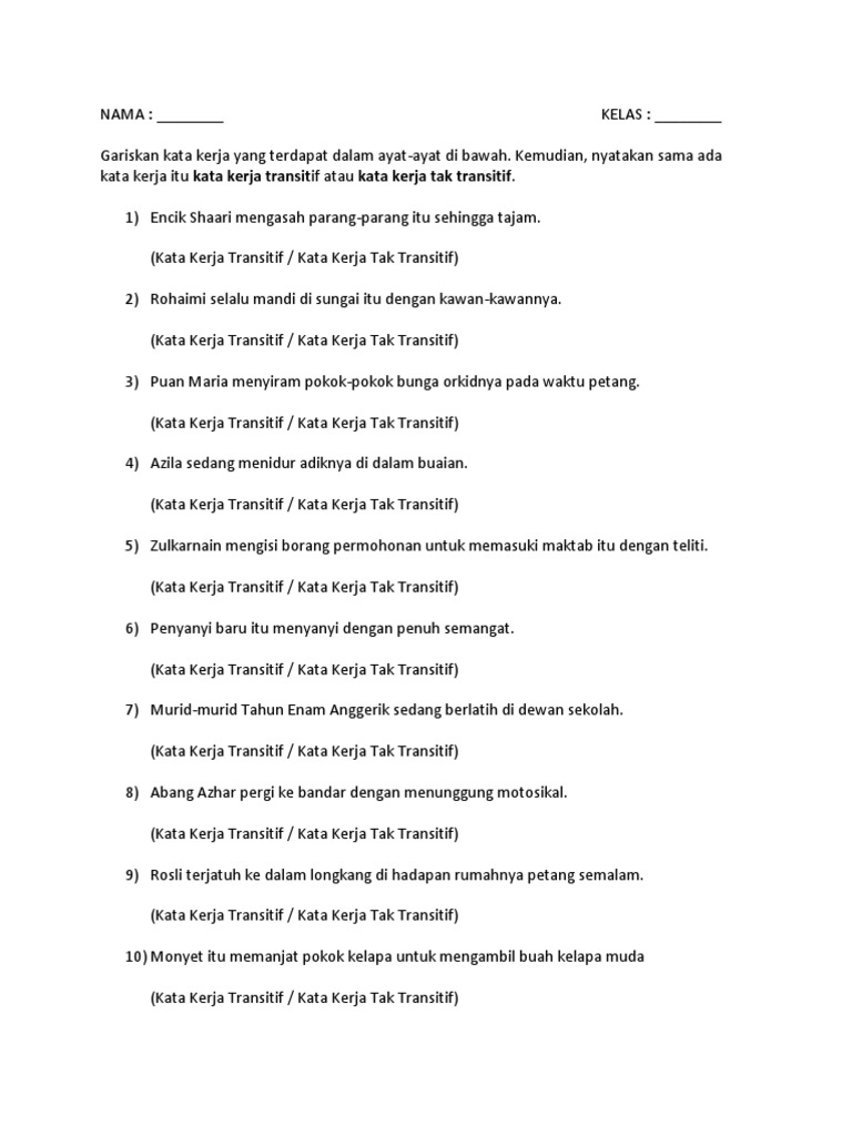 Kata Kerja Transitif Tahun 1 / Wandri senang karena orang tuanya memberinya lebih banyak uang.. Daripada perbincangan di atas, dapatlah kita. Kata kerja transitif ialah kata kerja yang mesti disertai oleh objek, iaitu kata nama. Kata kerja tak transitif by mohamed naim daipi 20128 views. Bersama cikgu fati 1 month ago. Kata kerja transitif dan tak transitif.