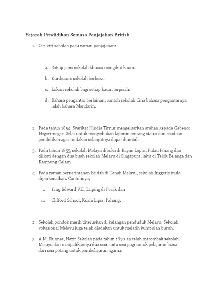 Ciri Ciri Sistem Pendidikan Semasa Penjajahan British San Kalop from img.dokumen.tips Hal ini kerana syarikat india timur adalah sebuah badan perniagaan yang hanya meletakkan penekanan. Lokasi sekolah bagi setiap kaum terpisah. Sejarah pendidikan di tanah melayu. Reaksi masyarakat tempatan terhadap penjajahan british. Penjajahan british di tanah melayu. Pengeksploitasian yang berlaku hanya menguntungkan pihak kolonial british. Hala tuju pendidikan semasa zaman penjajahan inggeris bertujuan menyekat peluang orang melayu untuk mengembangkan bakat. 3 lima fasa zaman pramerdeka (sebelum 1957) zaman pasca merdeka ( ) zaman dasar ekonomi baru ( ) zaman pembangunan negara ( ) zaman dasar wawasan negara ( ).