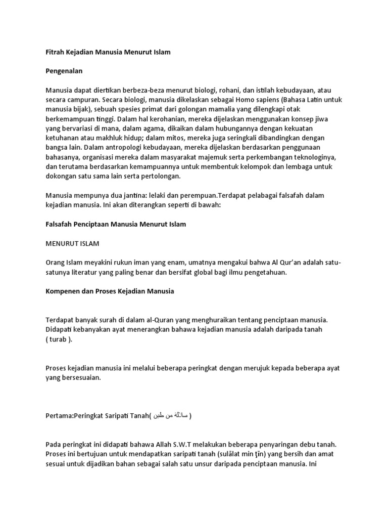Maka sudah fitrah kita, jika dalam segala kejadian kita senantiasa mencari. Kemudian kita akan dimintai pertanggungjawaban atas apa yang telah kita lakukan semasa di dunia. Bila kita menjalankan ibadah yang allah amanatkan kepada kita maka selamatlah kita. Noda dan dosa sep erti bayi yang baru lahir. Asal kejadian ini justru harus dijadikan pangkal tolak dalam menetapkan pandangan hidup bagi orang islam. Proses kejadian manusia ketiga adalah kejadian semua keturunan adam dan hawa kecuali nabi isa a.s. Falsafah kejadian manusia menurut sains dari perspektif islam. Dan apakah mereka tidak memperhatikan bagaimana allah menciptakannya(manusia)dari permulaannya,dan kemudian mengulanginya(kembali).sesungguhnya ,yang. Manusia serta peringkat proses kejadian manusia. Menurut kamus dewan, istilah fitrah ditakrifkan sebagai satu sifat semulajadi atau bakat pembawaan and juga sebagai perasaan keagamaan. Apa yang dicari oleh manusia? Manusia disebut dengan lafaz insane (mufrad) atau nas (jama). Di dalam al qur'an proses kejadian manusia secara biologis dejelaskan.
