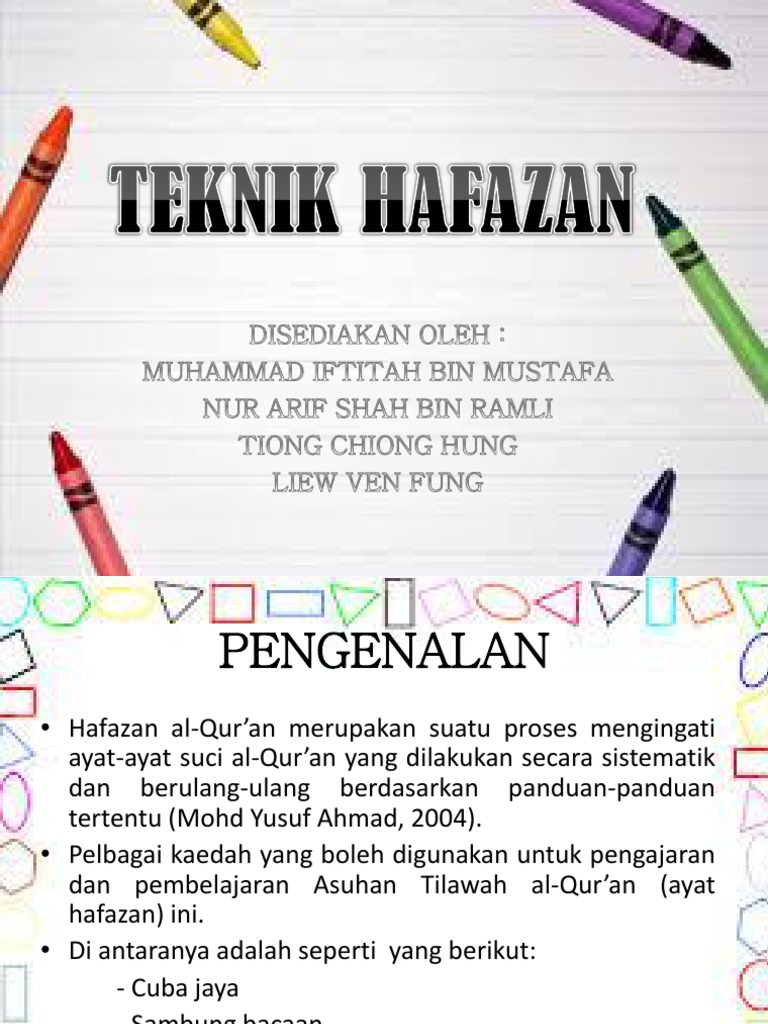 Kaedah dan teknik pengajaran tilawah al quran dan hafazan. Namun hafazan ini juga memerlukan kepada kaedah icadah yang betul dan bersesuaian dengan setiap huffaz. For more information and source, see on this link : Abdul hafiz abdullah, hussin salomon, azmi shah suratman & sulaiman shakib mohd noor. Tanpa kaedah yang betul dan komitmen yang tinggi, hafazan akan hilang dari ingatan huffaz dalam masa yang singkat.